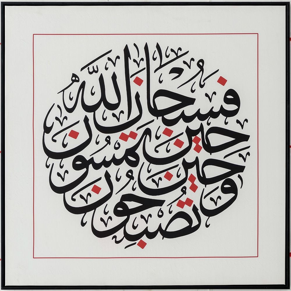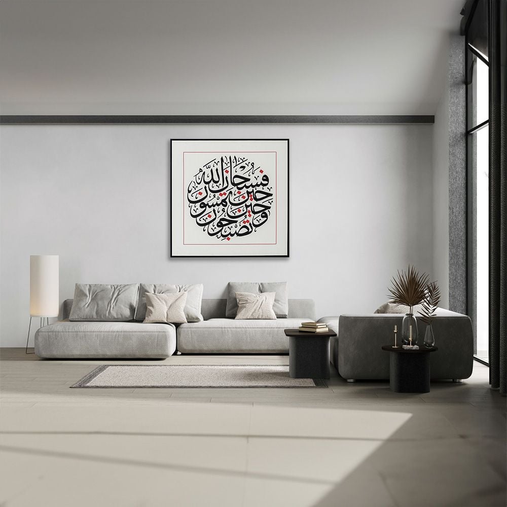 Add spiritual beauty to your home with this elegant Islamic calligraphy wall art, featuring intricate Arabic script arranged in a circular pattern with striking black and red detailing. The balanced composition and fine craftsmanship reflect faith, harmony, and devotion. Perfect for modern or traditional interiors, this artwork brings a timeless sense of peace and cultural refinement to any space.