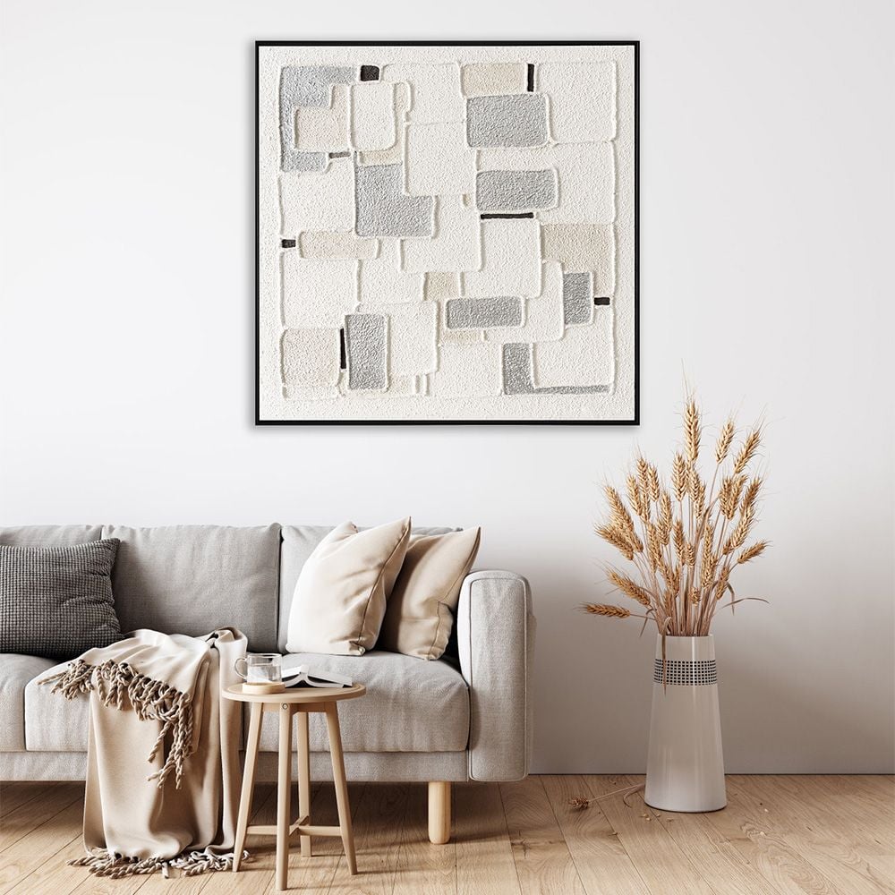 Bring subtle elegance to your interiors with this contemporary wall art, featuring layered geometric patterns in soothing shades of white, cream, and grey. The raised texture and minimalist design create a refined, three-dimensional effect that adds depth and balance to any space. Perfect for modern, neutral, or Scandinavian-inspired décor, this piece embodies calm sophistication and timeless style.