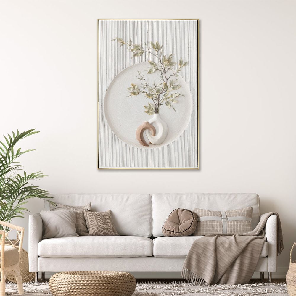 Enhance your space with this elegant wall art, featuring a sculpted vase and delicate leafy branches that bring a touch of nature indoors. The subtle textures and soothing neutral tones create a calm and refined aesthetic, making it a perfect addition to modern, minimalist, or nature-inspired interiors.