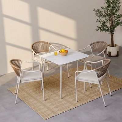 Perfect for gardens, balconies, or patios, this set includes a 2-seater sofa, three single chairs, and a marble-glass coffee table.