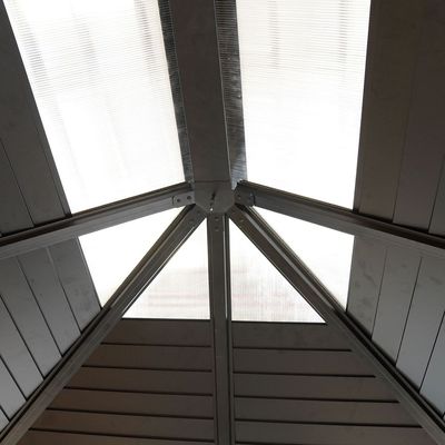 A transparent polycarbonate (PC) skylight panel at the center of the roof invites sunlight while maintaining shade and shelter, perfect for daytime lounging or evening ambiance under the stars.