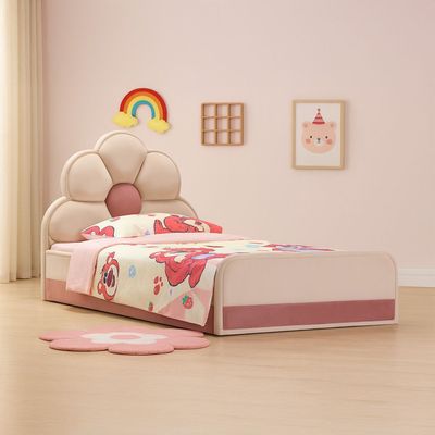 Lilyana Flower 90x200 Upholstered Kids Bed-Beige & Pink