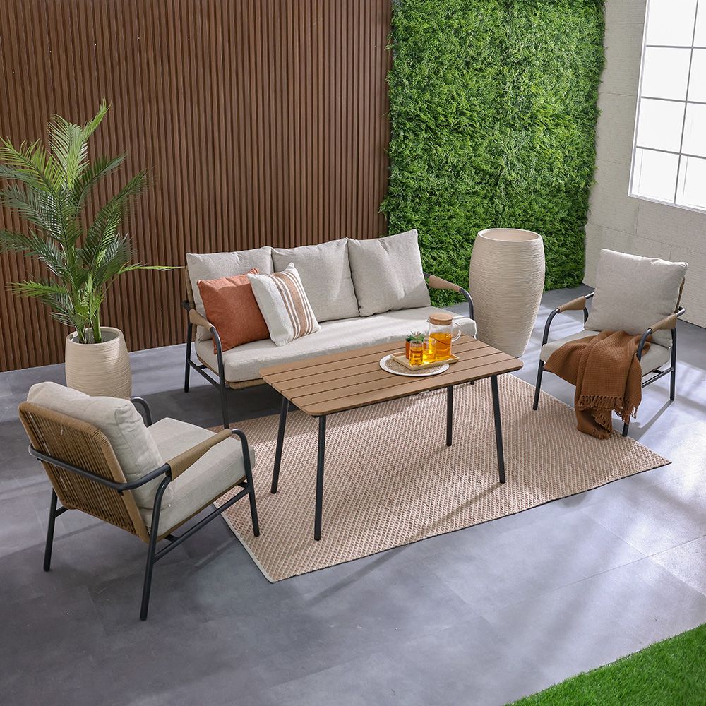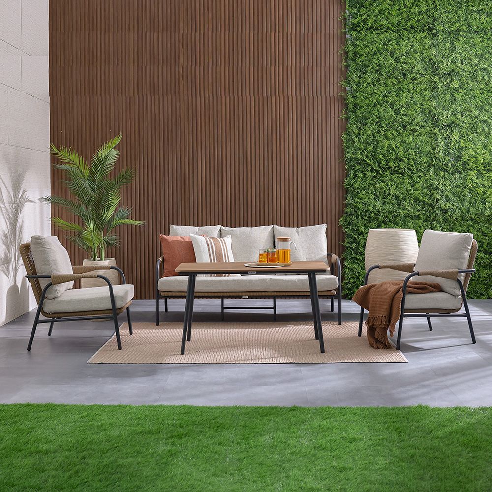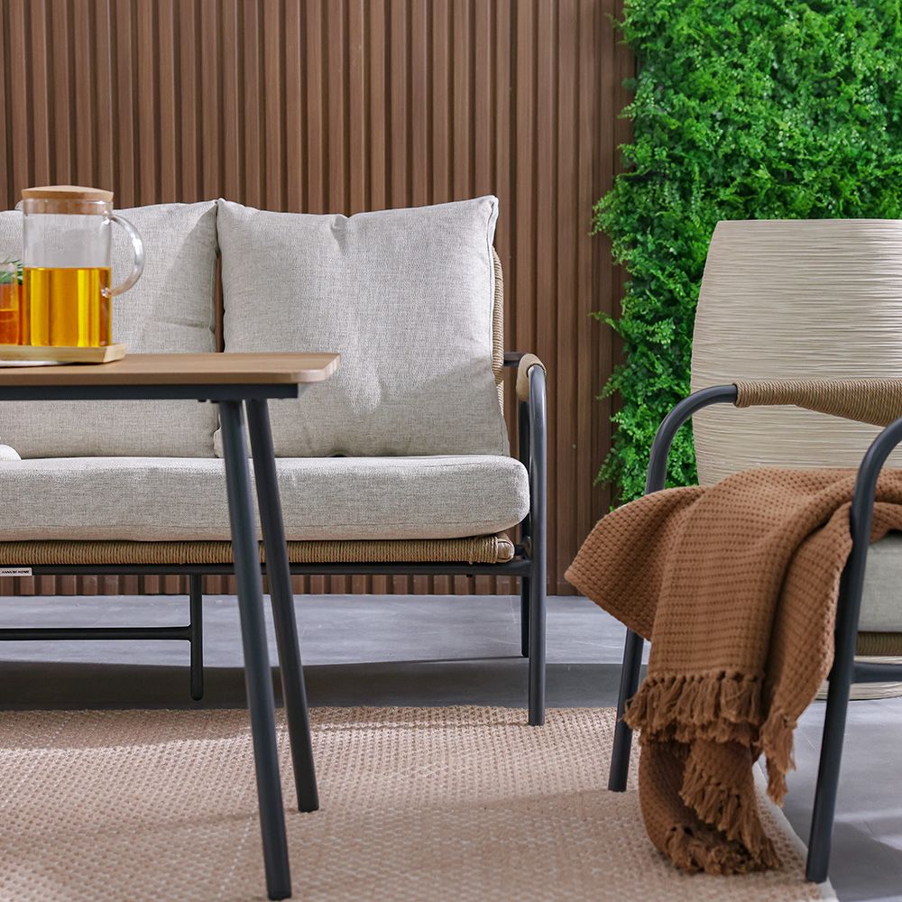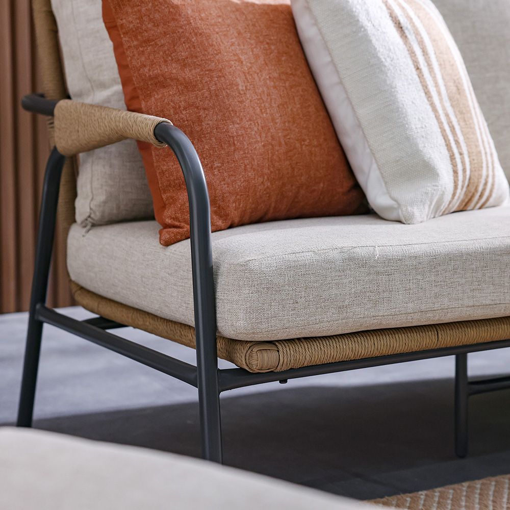 Wrapped in hand-woven, all-weather rattan and anchored by a durable steel frame, this sofa set balances strength with artisanal beauty.