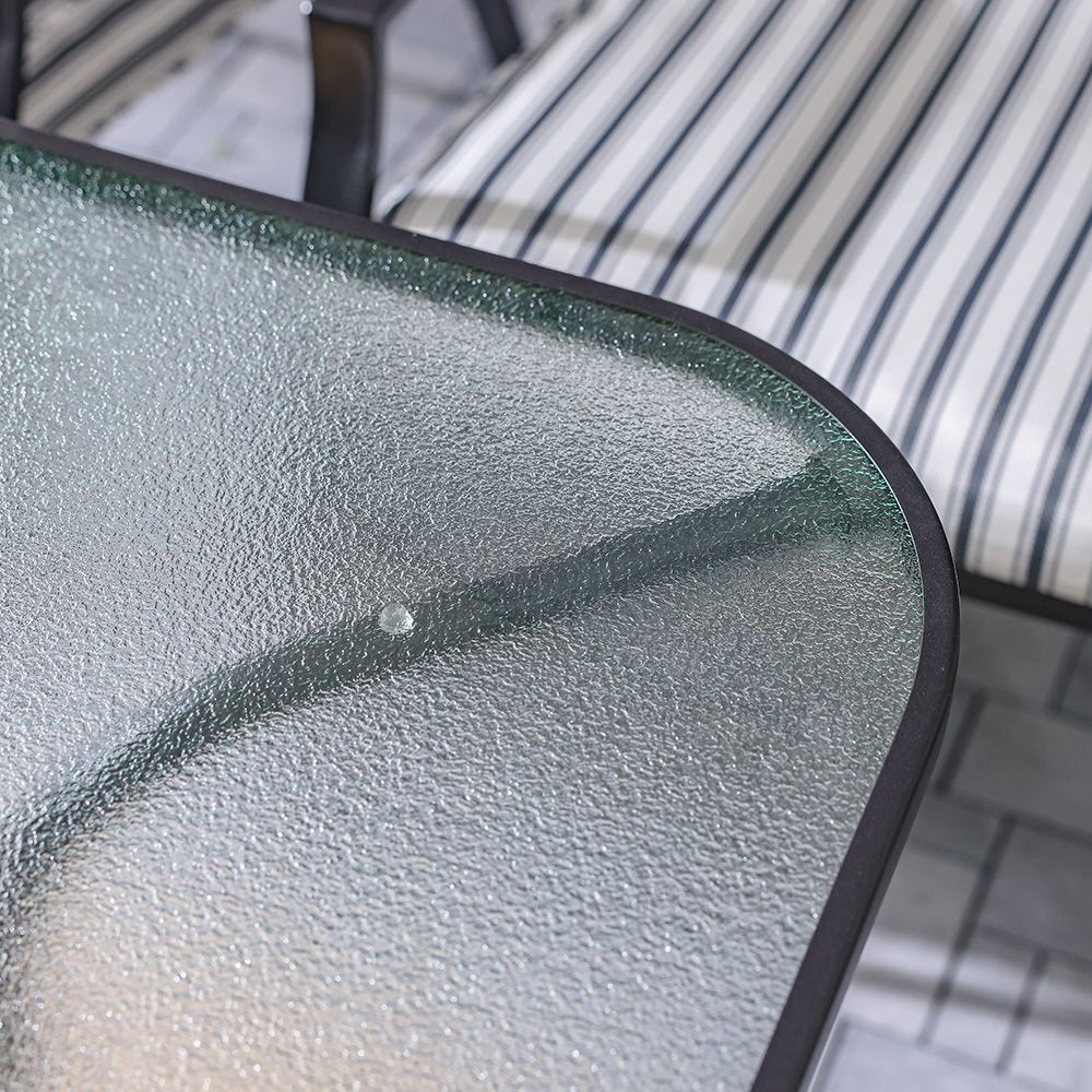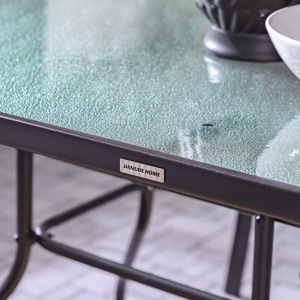 يلمع سطح الطاولة الزجاجي المقوى برقة تحت أشعة الشمس، مما يزيد من جمال الطقم.
