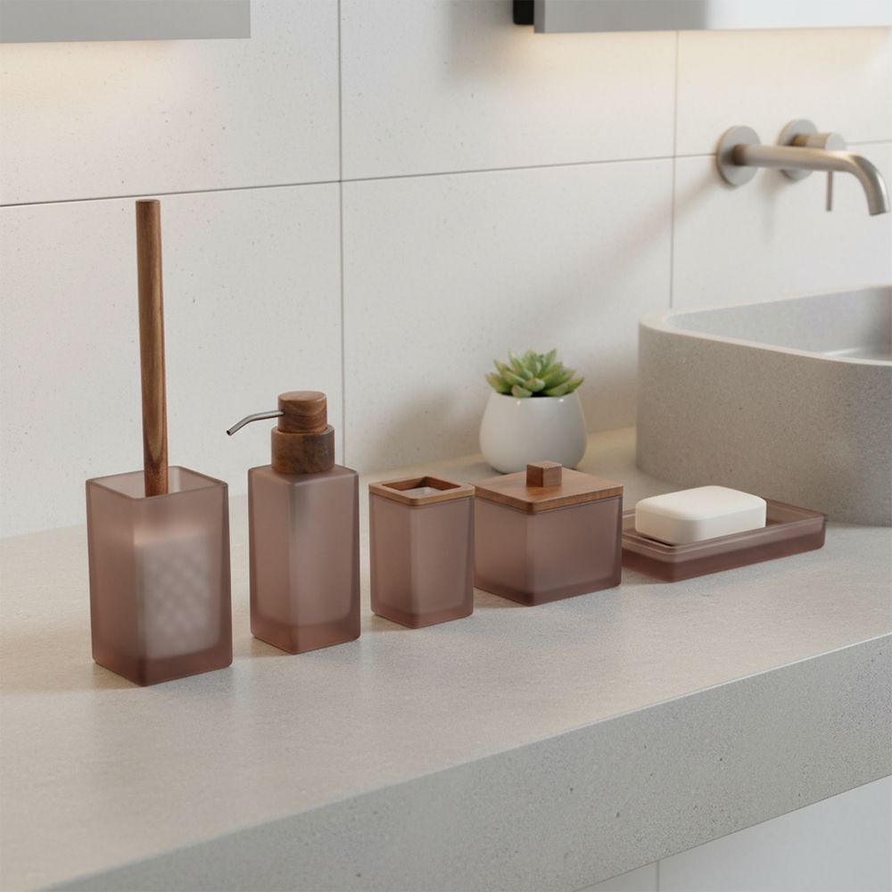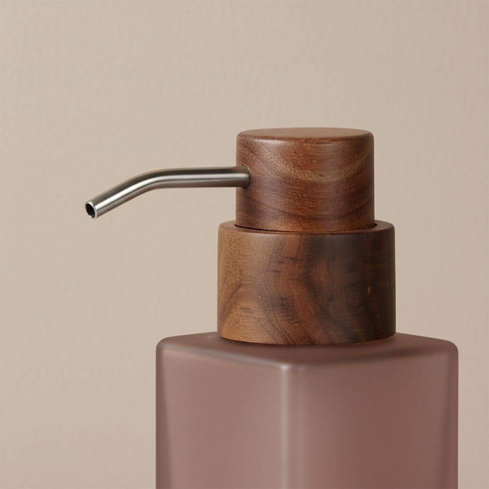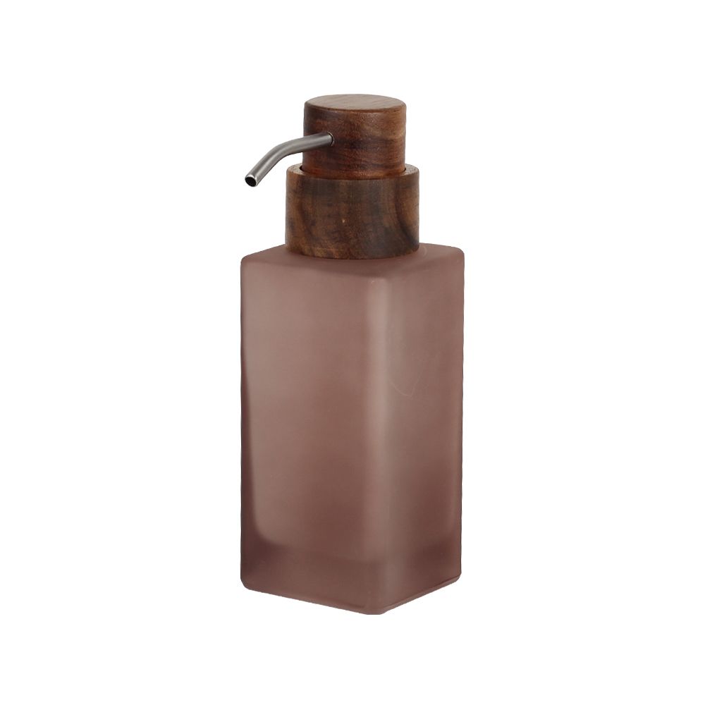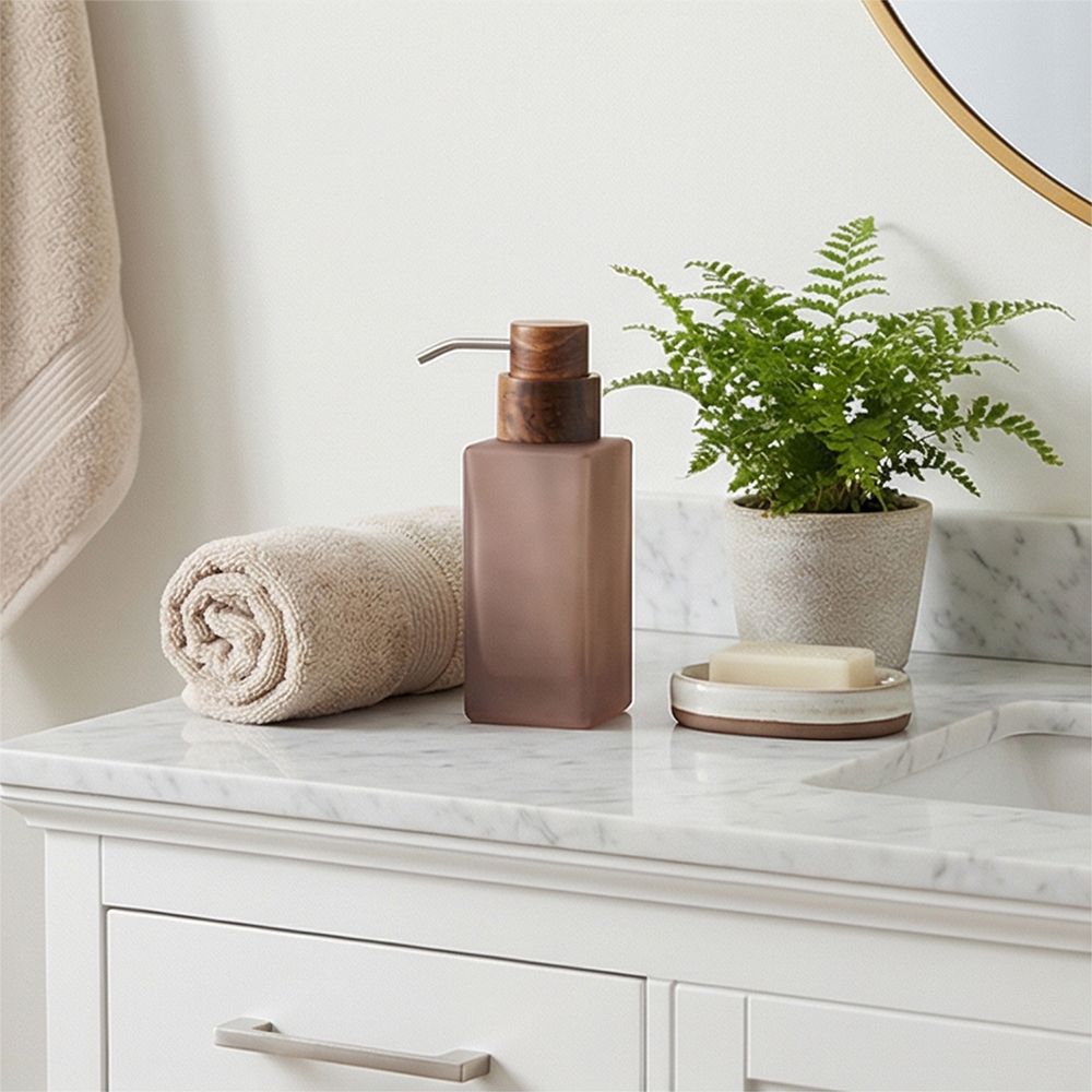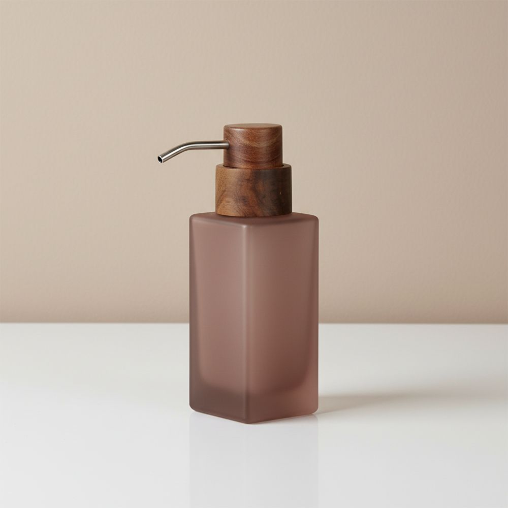 This frosted rose glass soap dispenser blends modern minimalism with natural warmth. Featuring a smooth matte glass body and a refined wood-look top with metallic pump, it adds a touch of organic elegance to any vanity or bathroom counter.