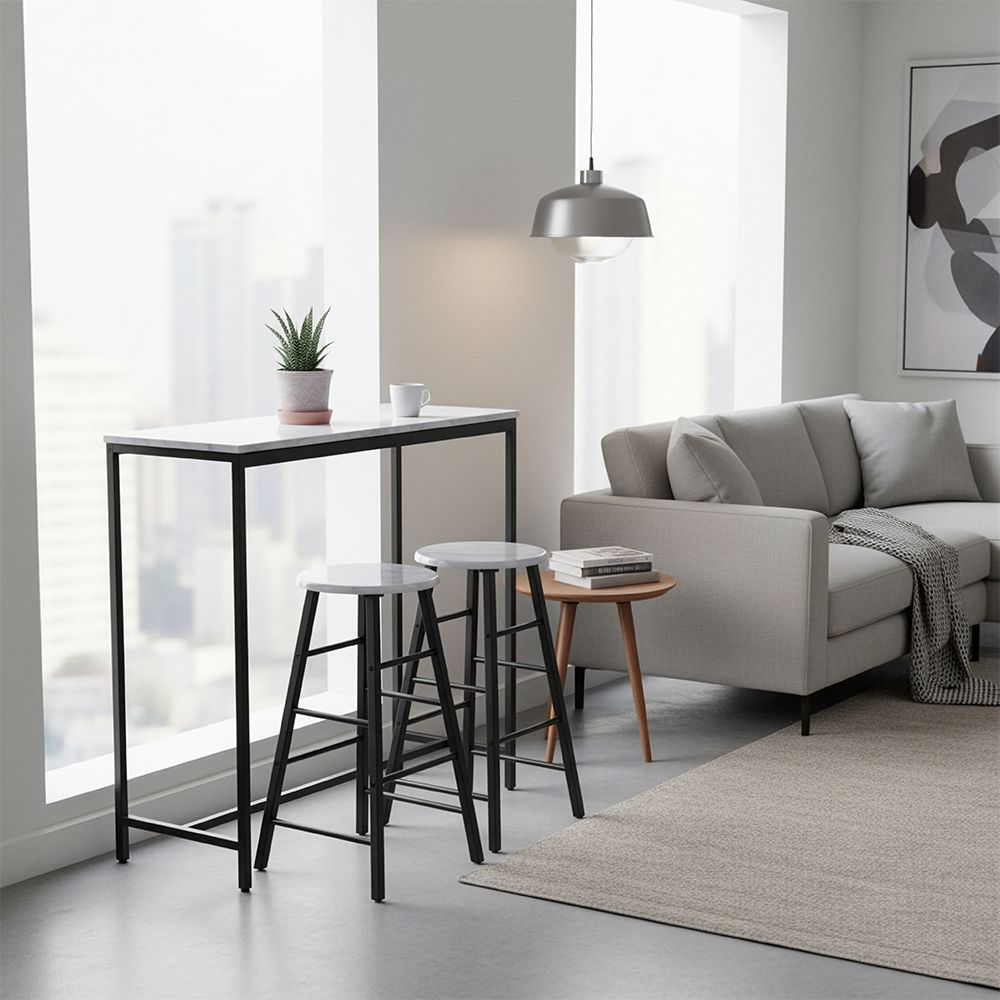 It includes a high table and two chairs, delivering a curated aesthetic to any given space.
