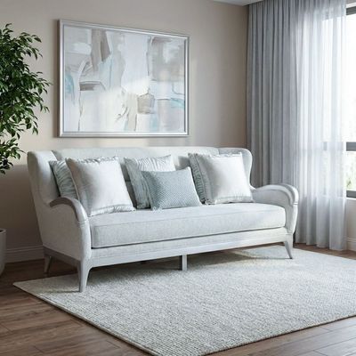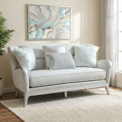 - Flaunting a curved arm style, the sofa is crafted from a combination of solid wood and engineered wood and wrapped in soft neutral toned fabric upholstery for an inviting vibe.