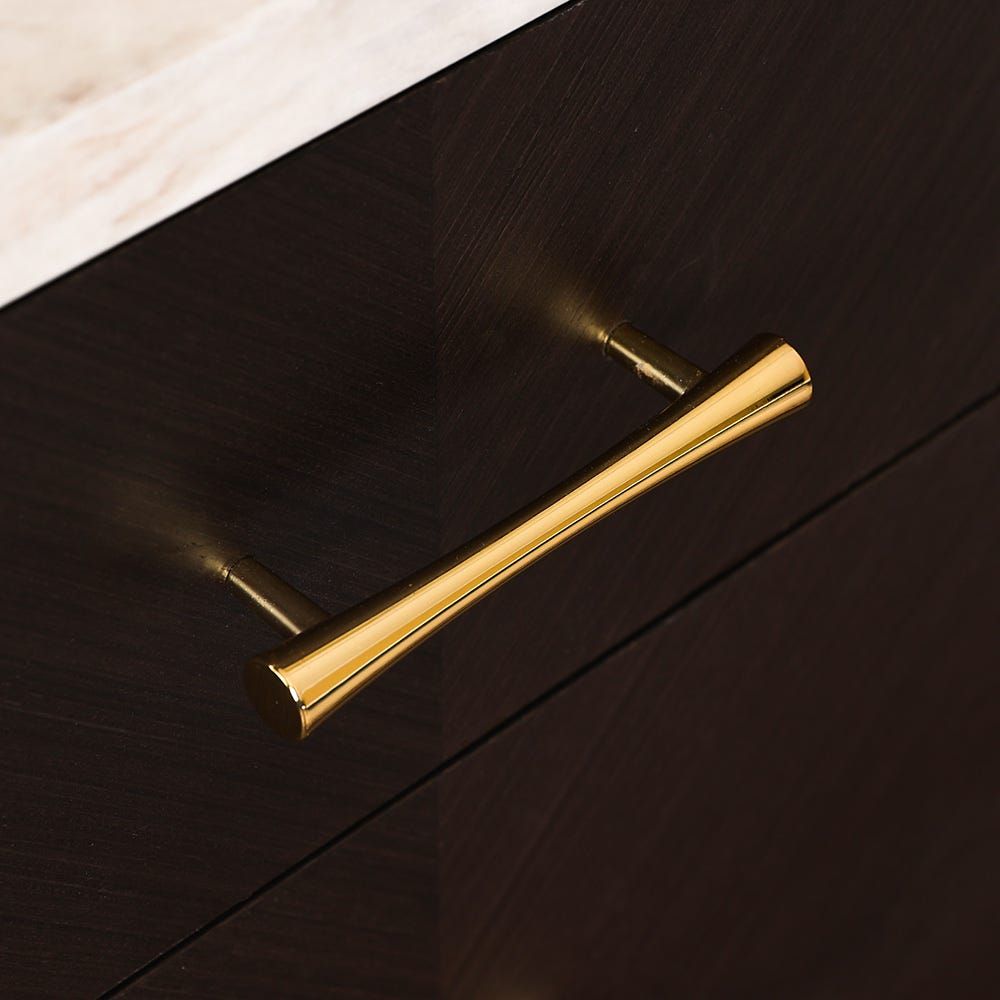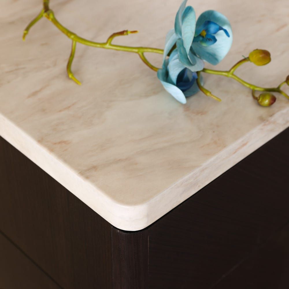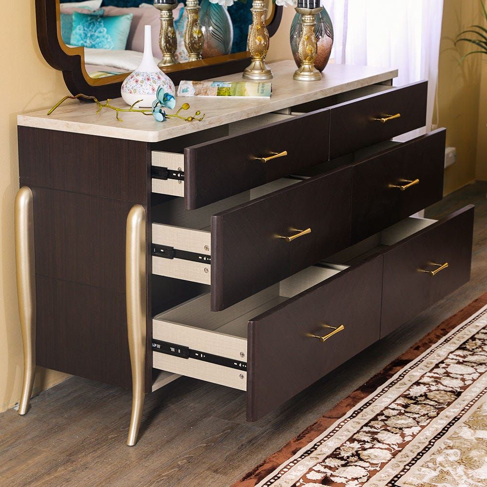 Provided with variety of drawers and cabinet adorned with metal handles for keeping daily items