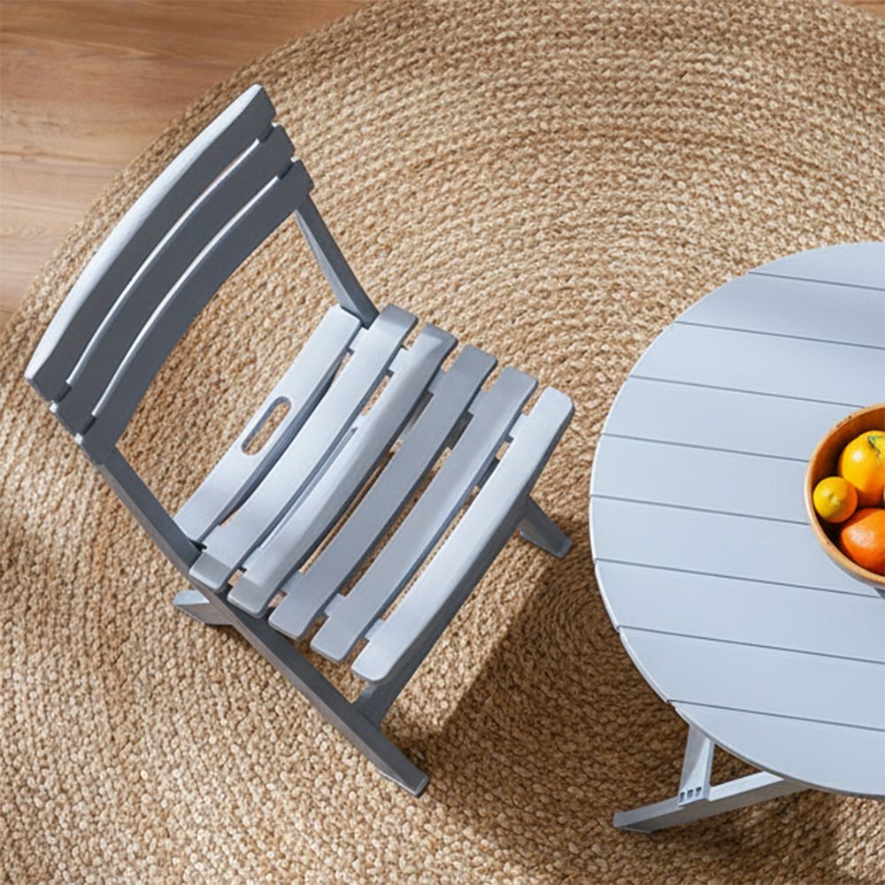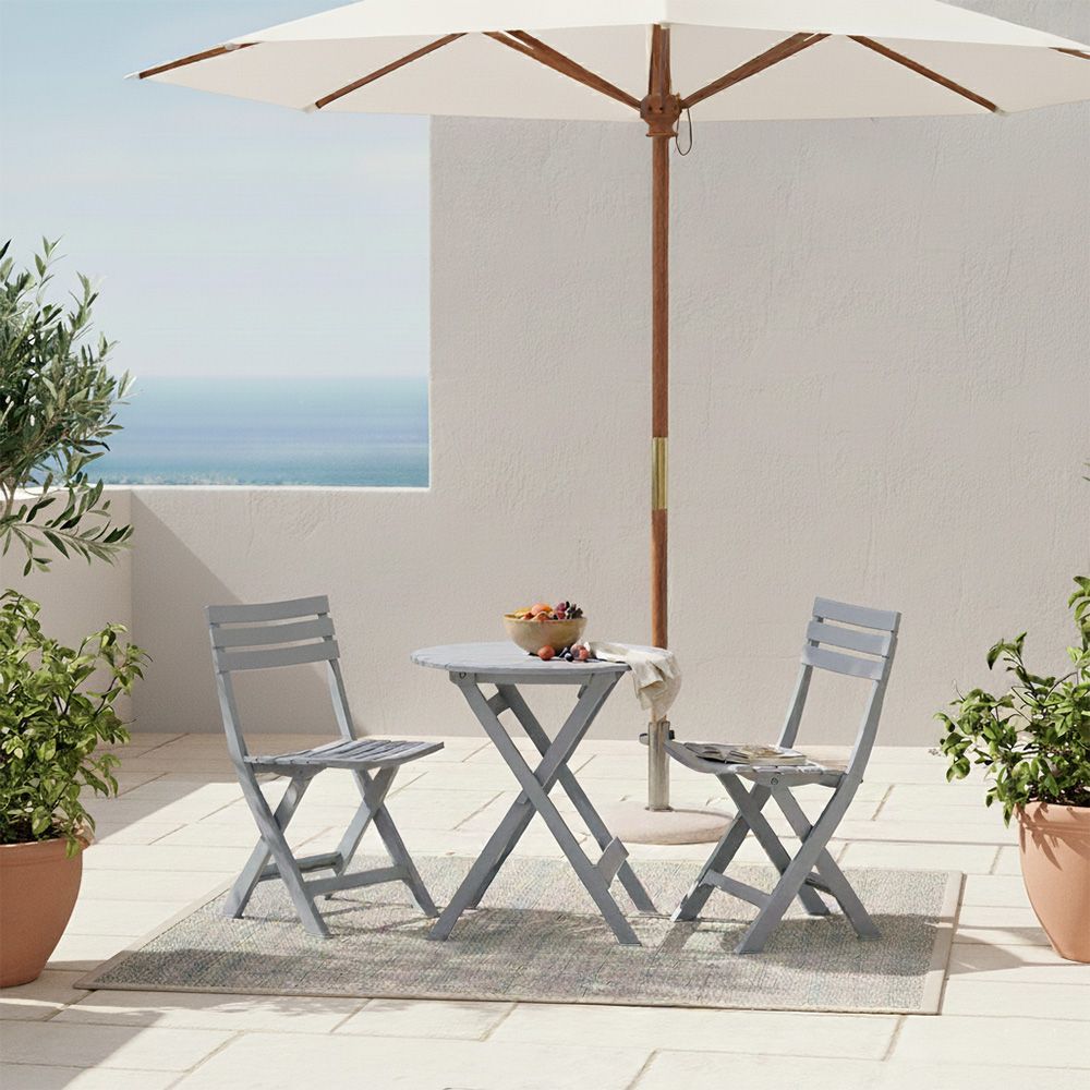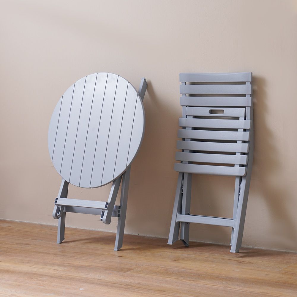 This chic ensemble includes two flawless folding chairs and a sleek, matching table.