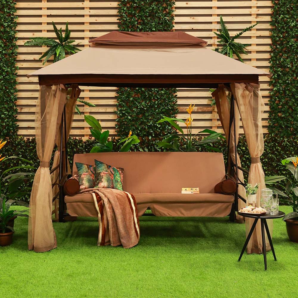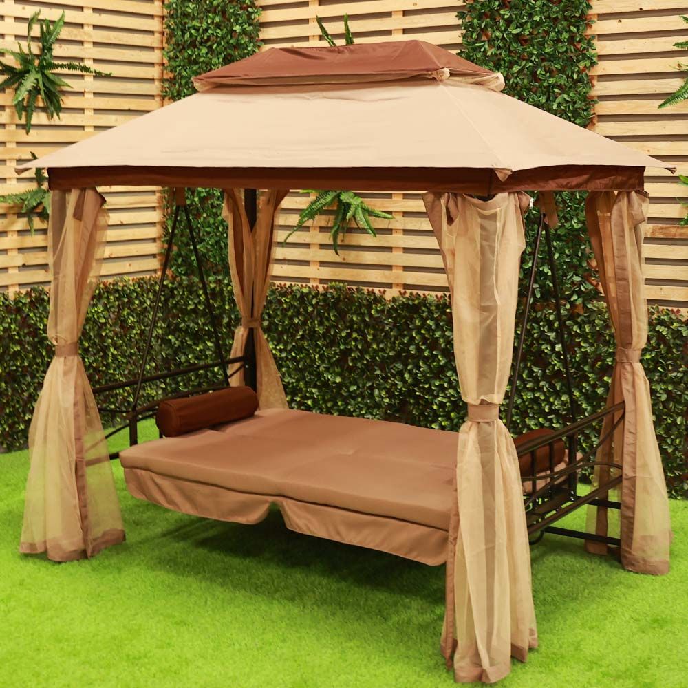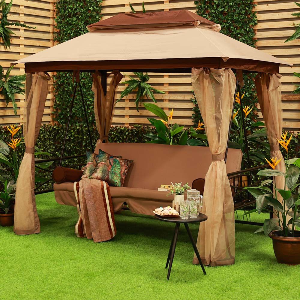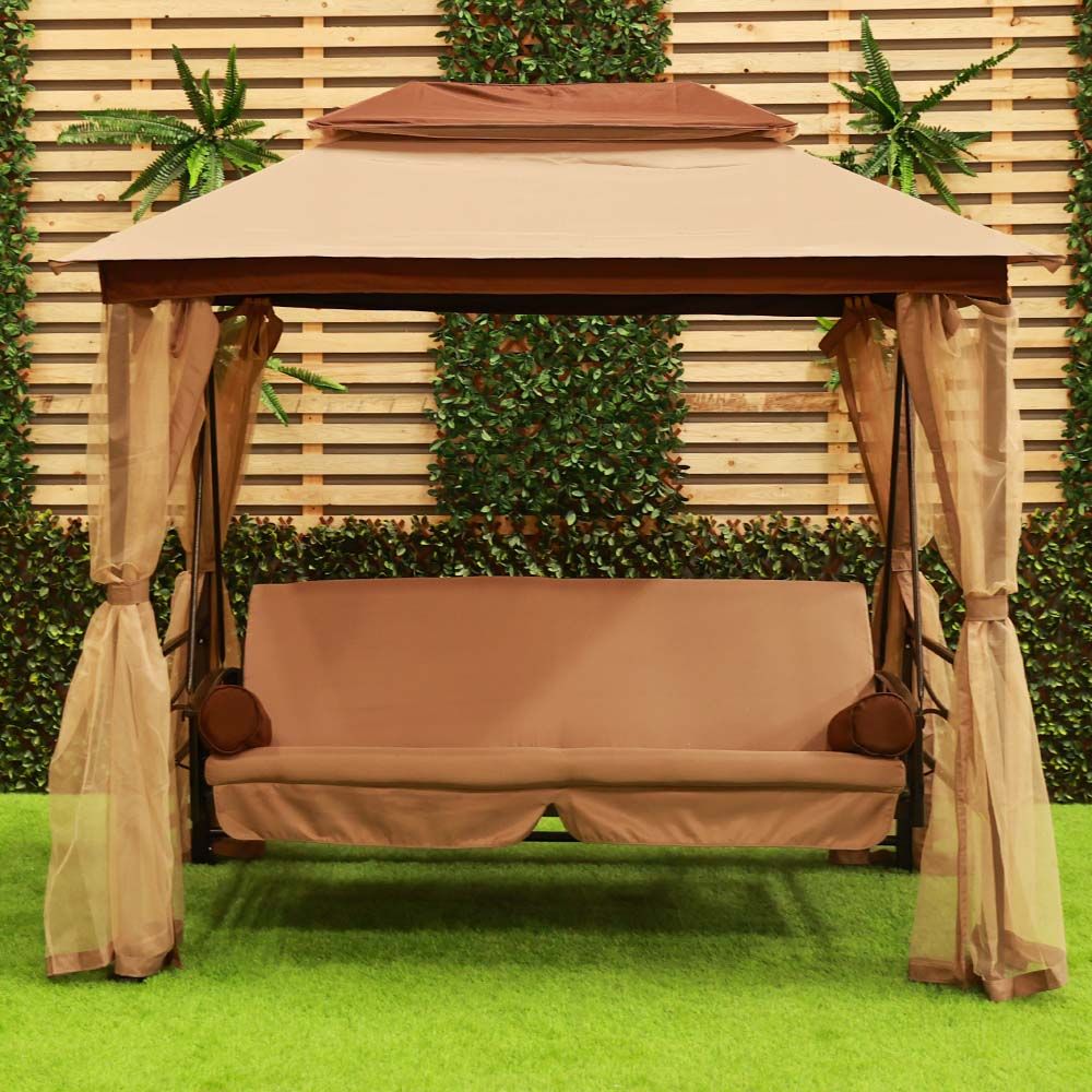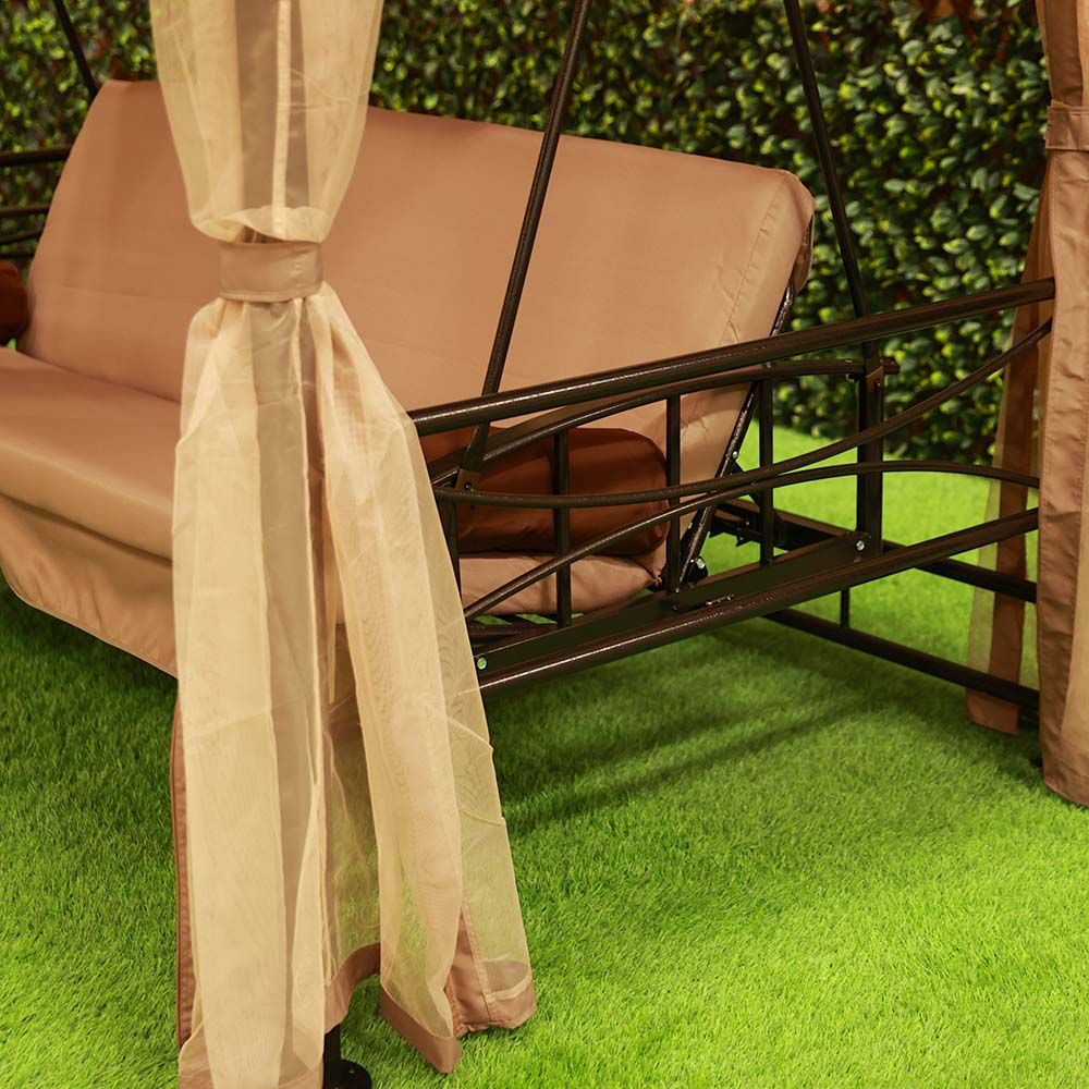 Gretta 3-Seater Swing Bed with Roof and Cushions - Brown
