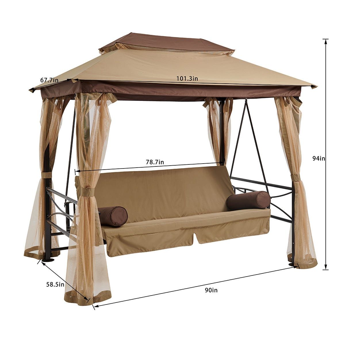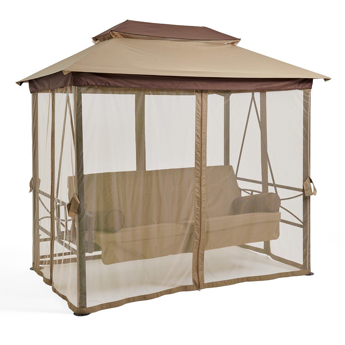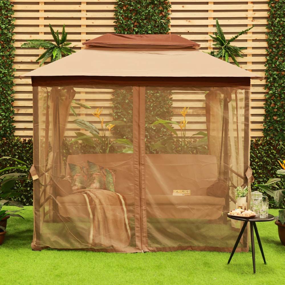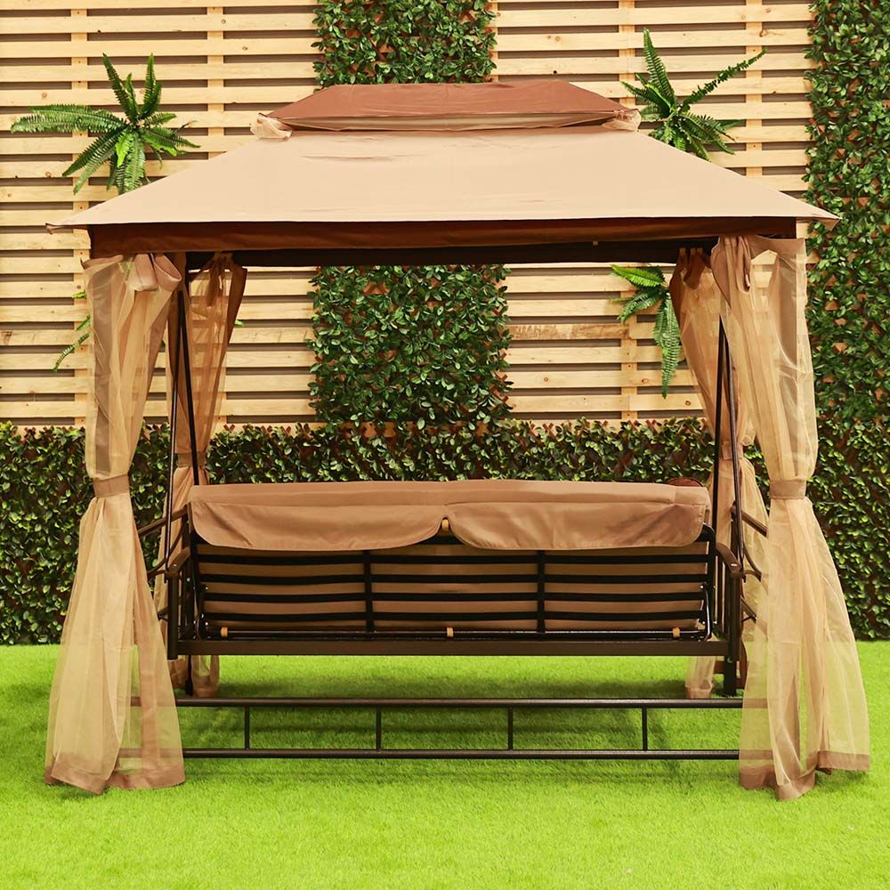 Gretta 3-Seater Swing Bed with Roof and Cushions - Brown