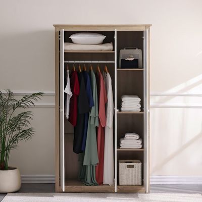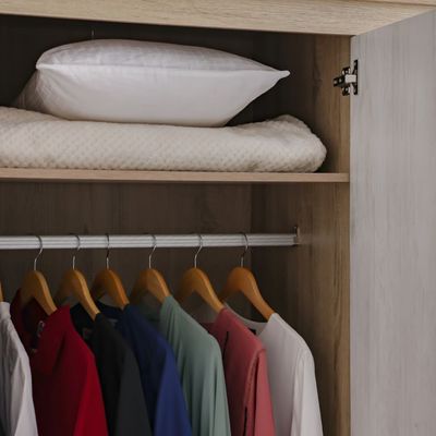 The four spacious shelves, including a hanging rod, offer flexible storage for folded items, accessories, and long garments.