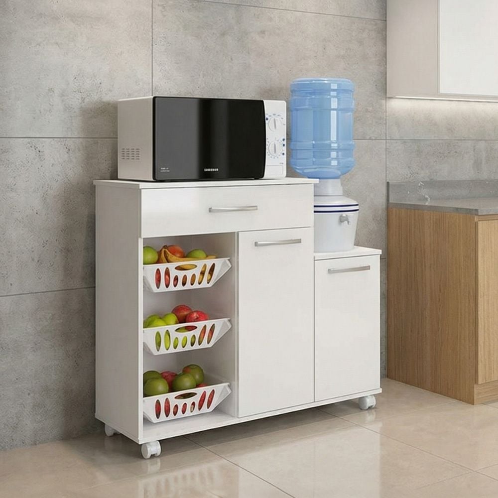 It features a spacious drawer, two closed cabinets, and three fruit baskets. It allows for organized storage and display of a wide range of items, from kitchen essentials to décor items.