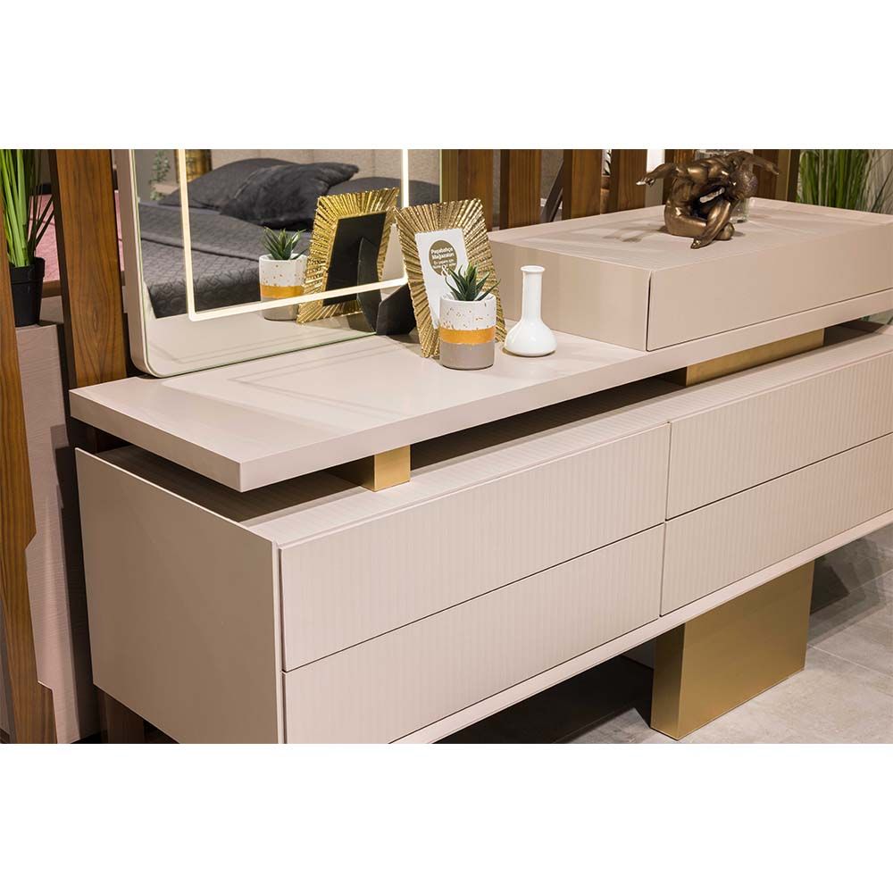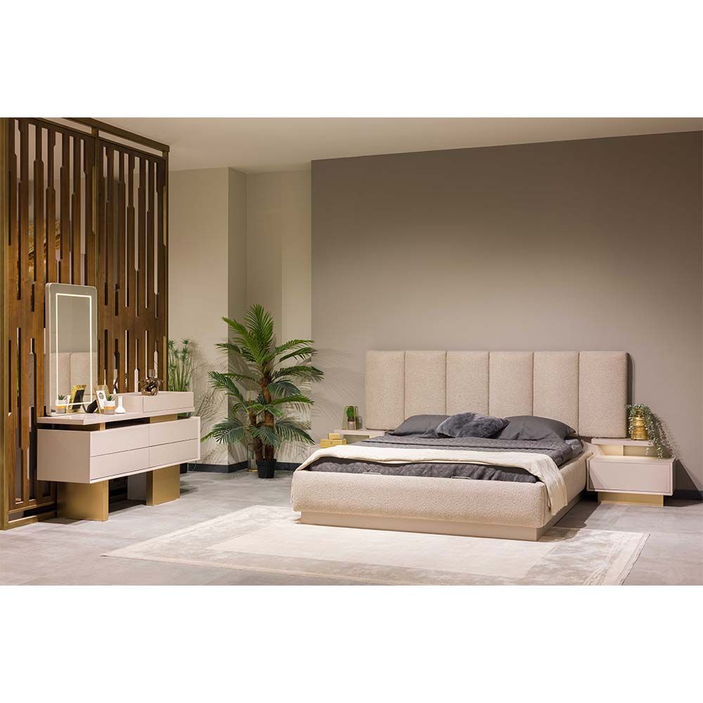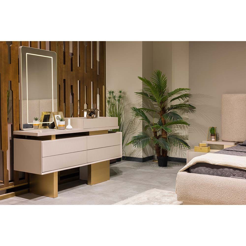 Monza 180x200 King Bed Set with Hydraulic Storage + Dresser with Mirror & LED + Pouf + 2 Nightstands - Cream/Gold - With 2-Year Warranty