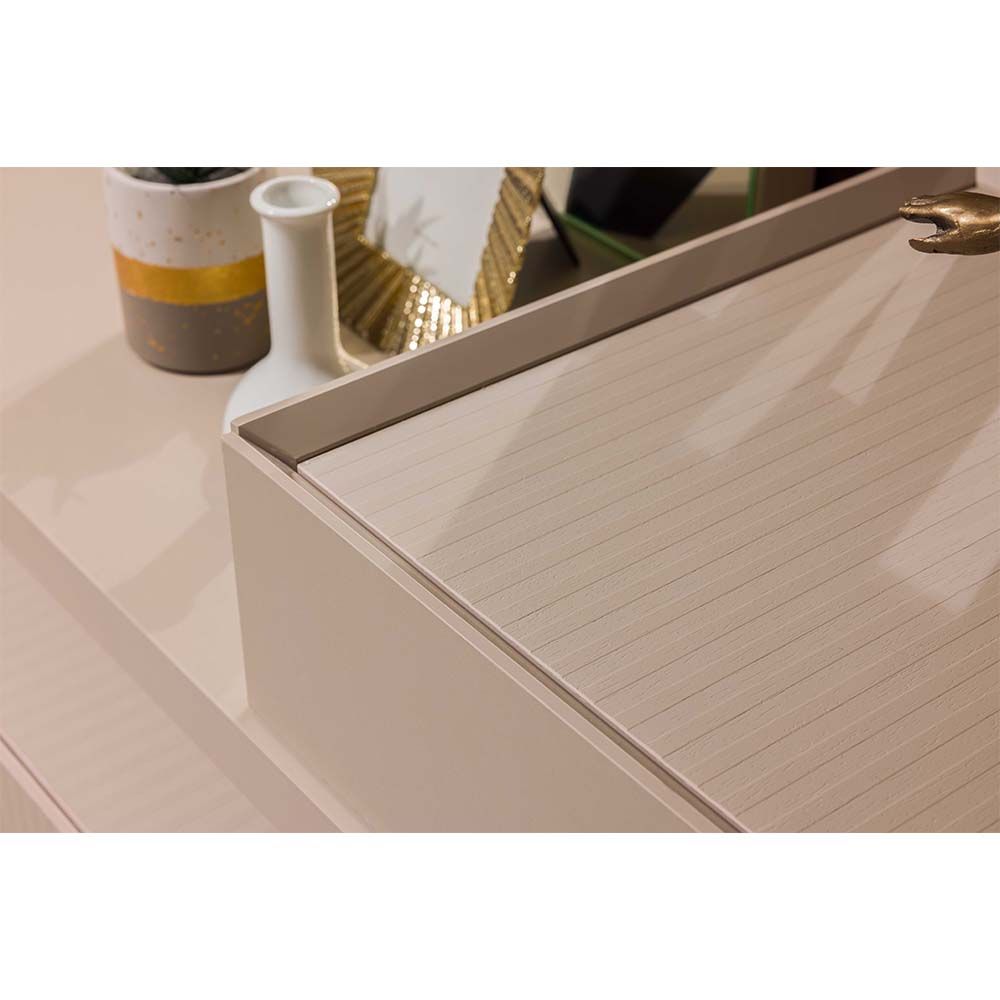The centerpiece of the set, the king bed, features a high headboard and fabric upholstery, adding a touch of refinement to your space. The hydraulic under-bed storage offers ample space for stacking away extra bedding and other belongings.