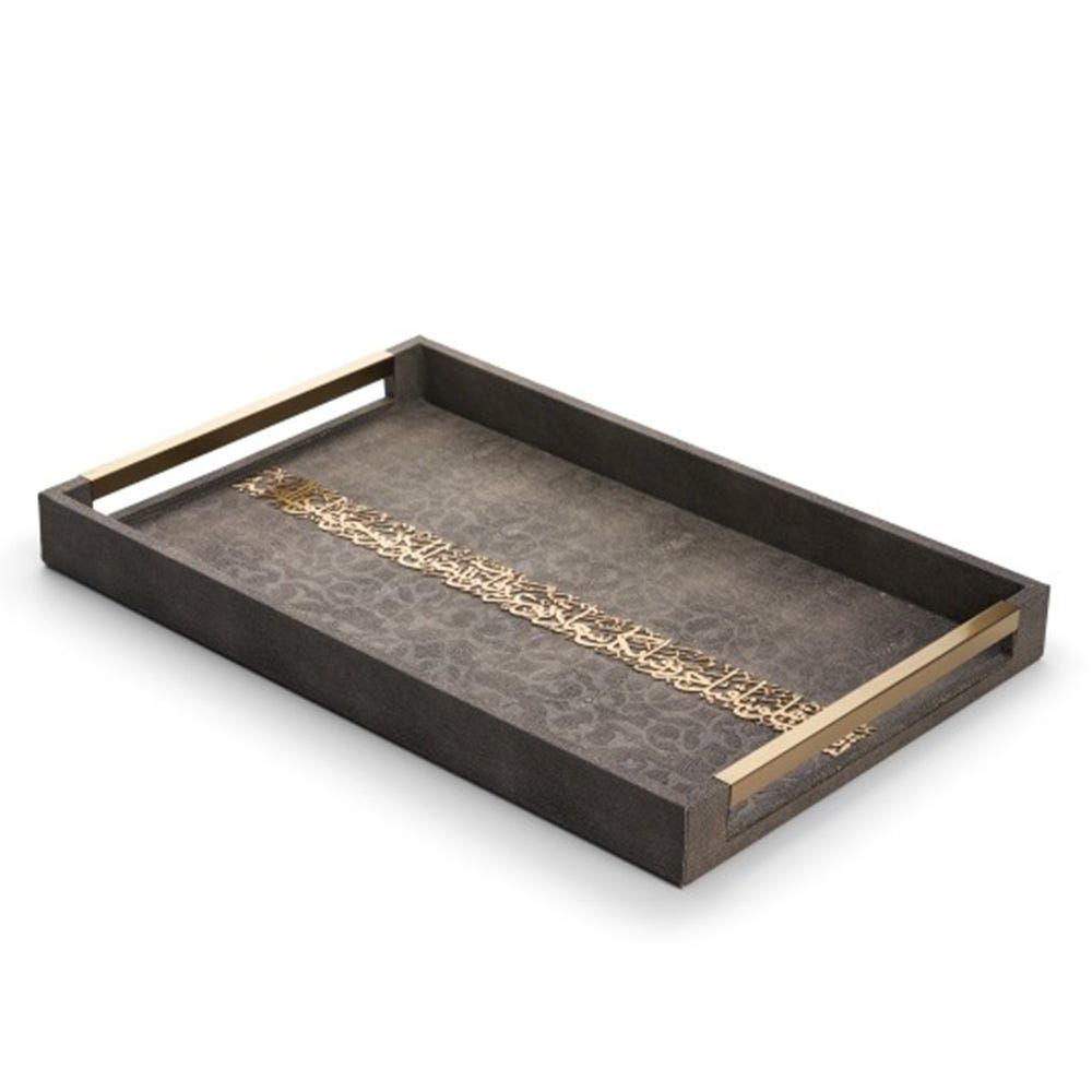 - This grey-colored serving tray is made of luxurious leather material, and is decorated with golden-colored Arabic letters.