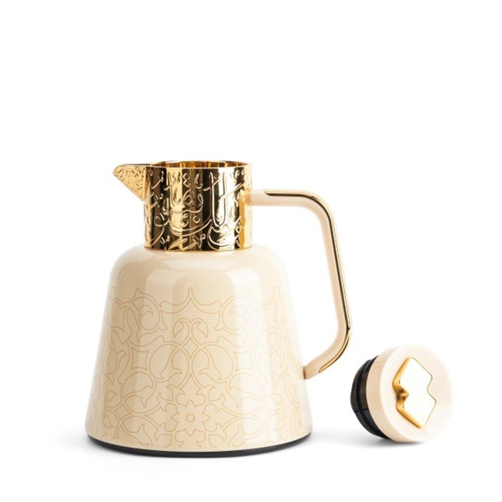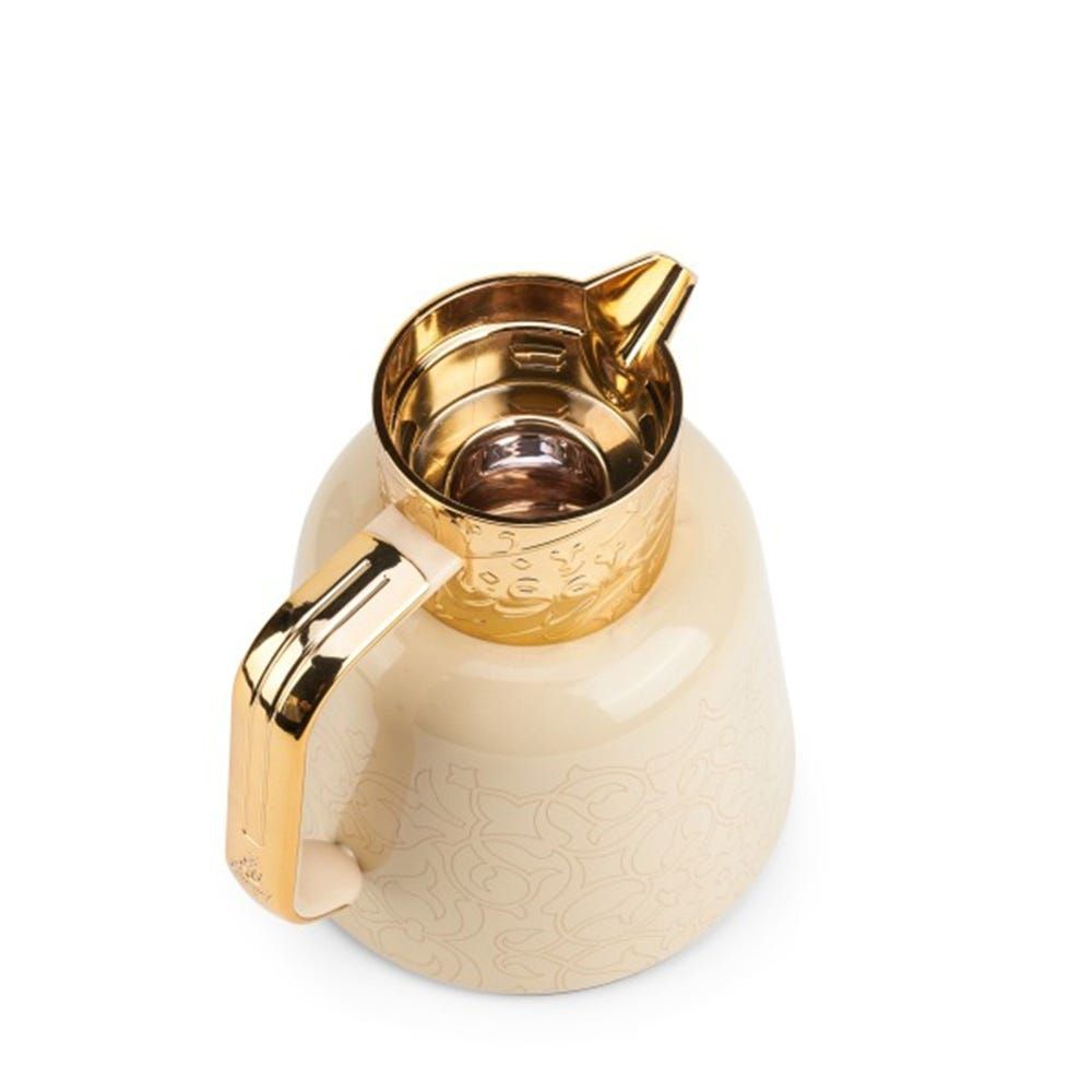 - An beige-colored elegant pot with Arabic carvings, made with high craftsmanship to preserve the heat of liquids for at least 12 hours.