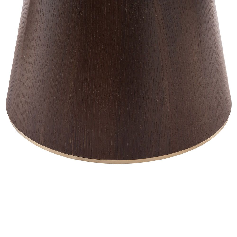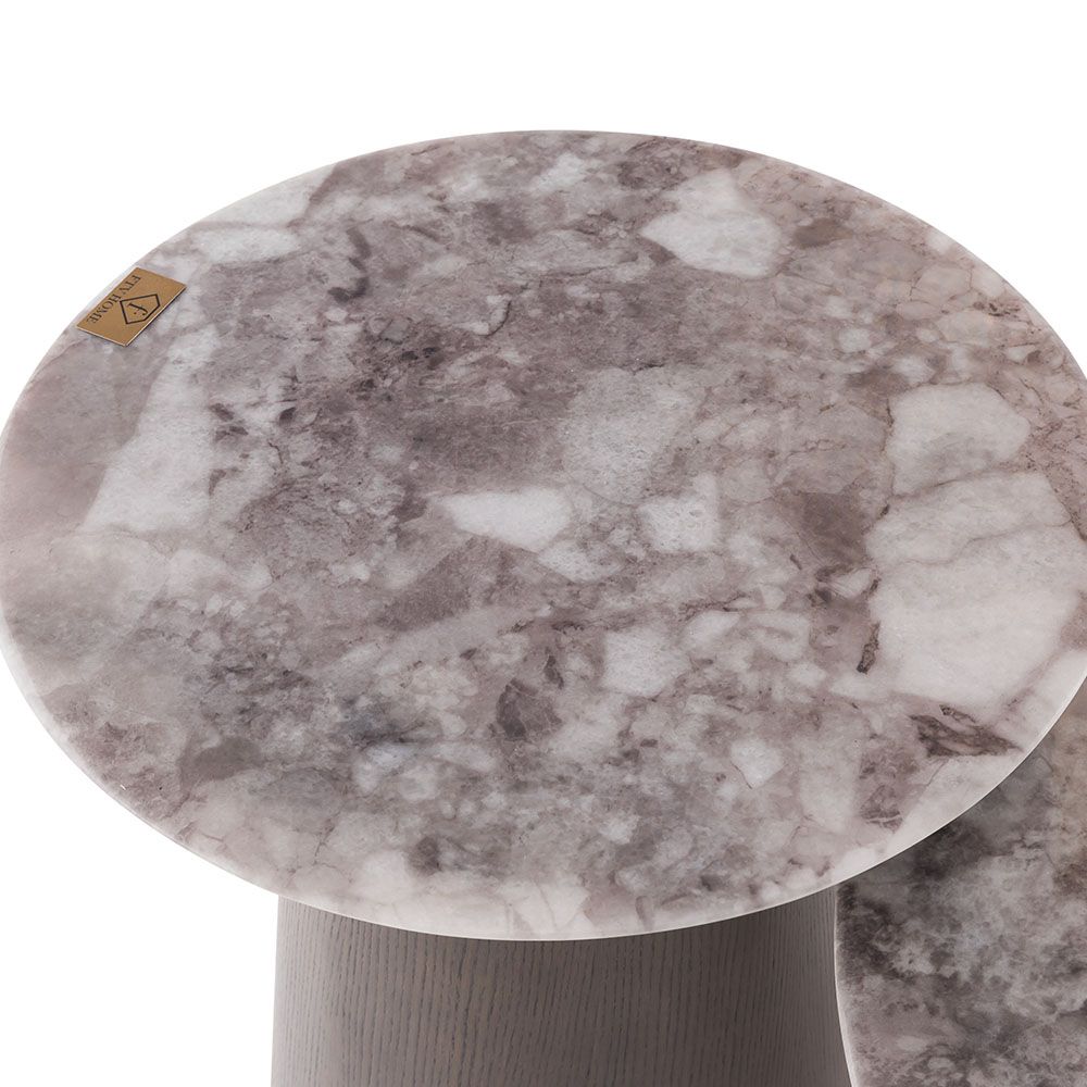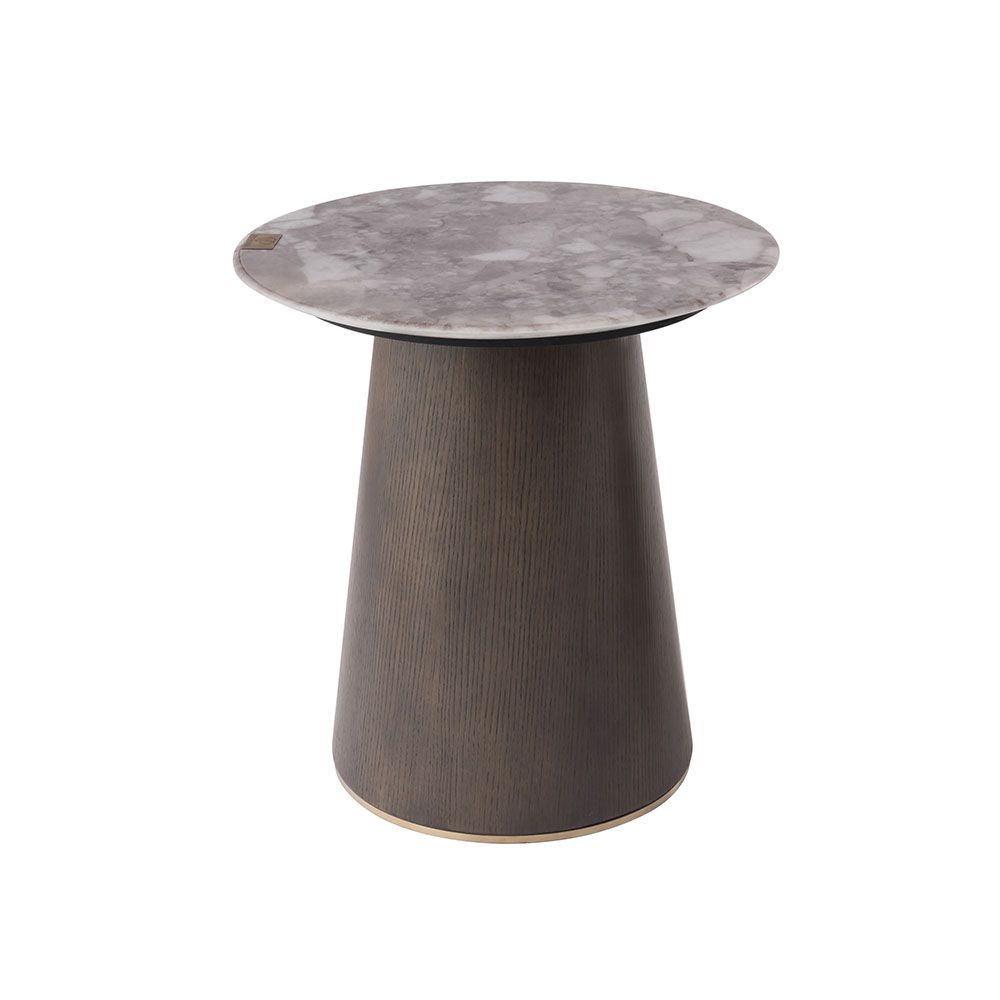 The round marble table top in grey blended with the brown wooden build makes the table stand out in any room.