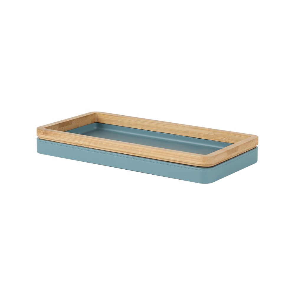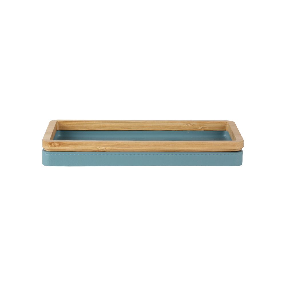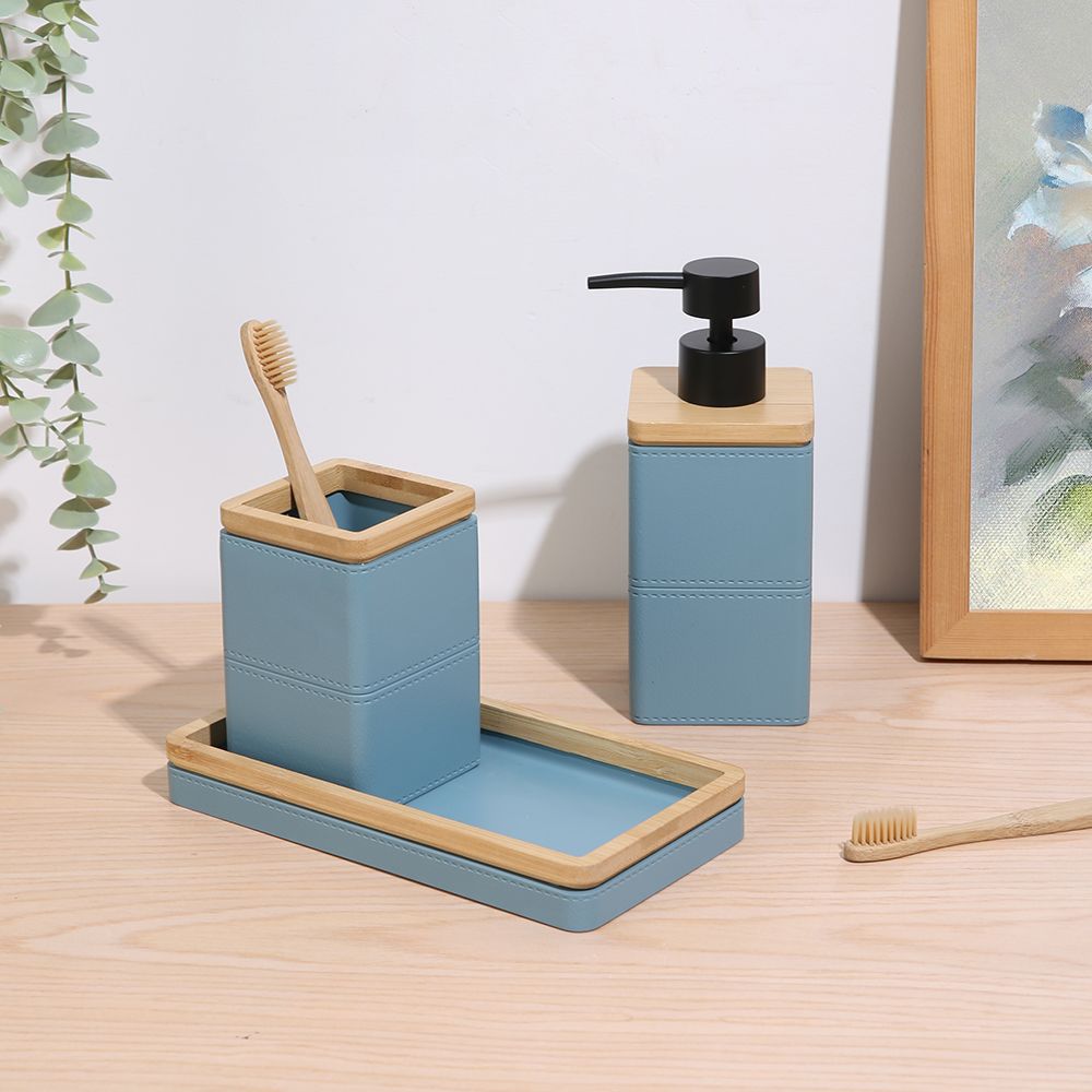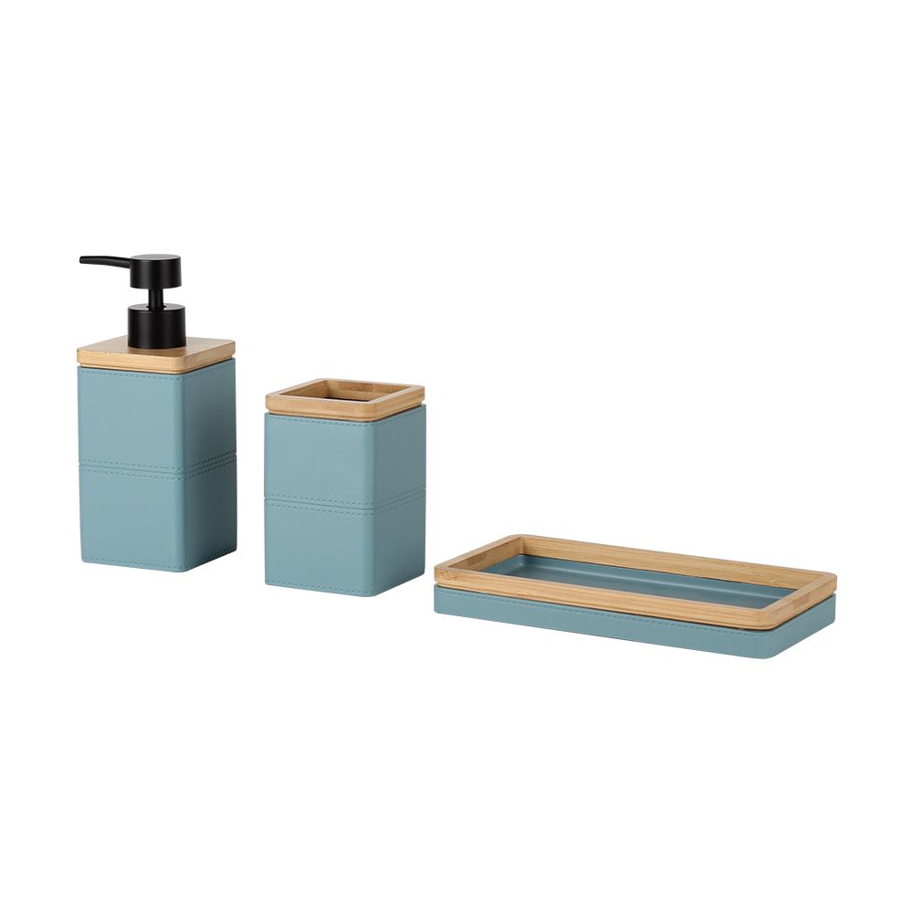 Includes soap dispenser, tumbler, and tray.