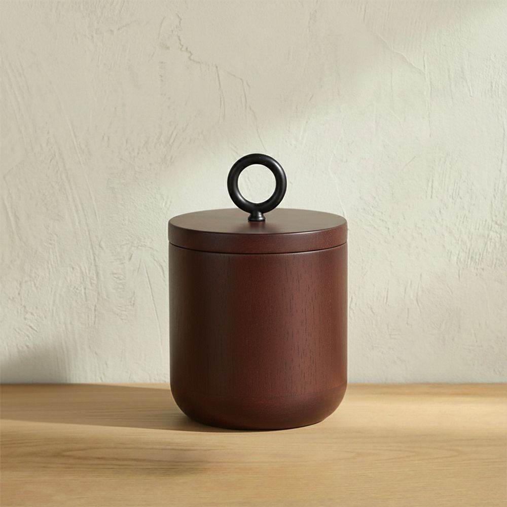 Fitted lid with black metal ring handle for easy access.