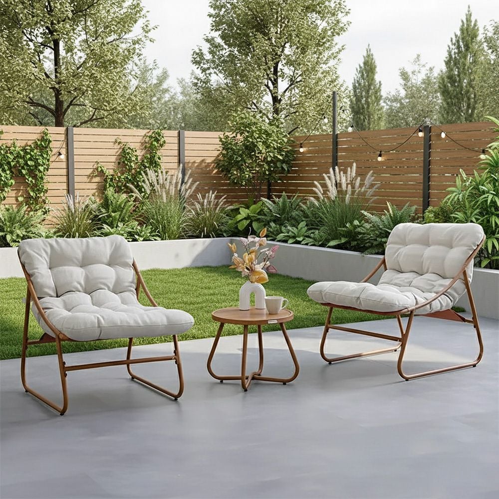 Featuring two ergonomically crafted chairs and a sleek round coffee table, this set is your ticket to sunset cocktails, morning coffees, and endless conversations under the open sky.