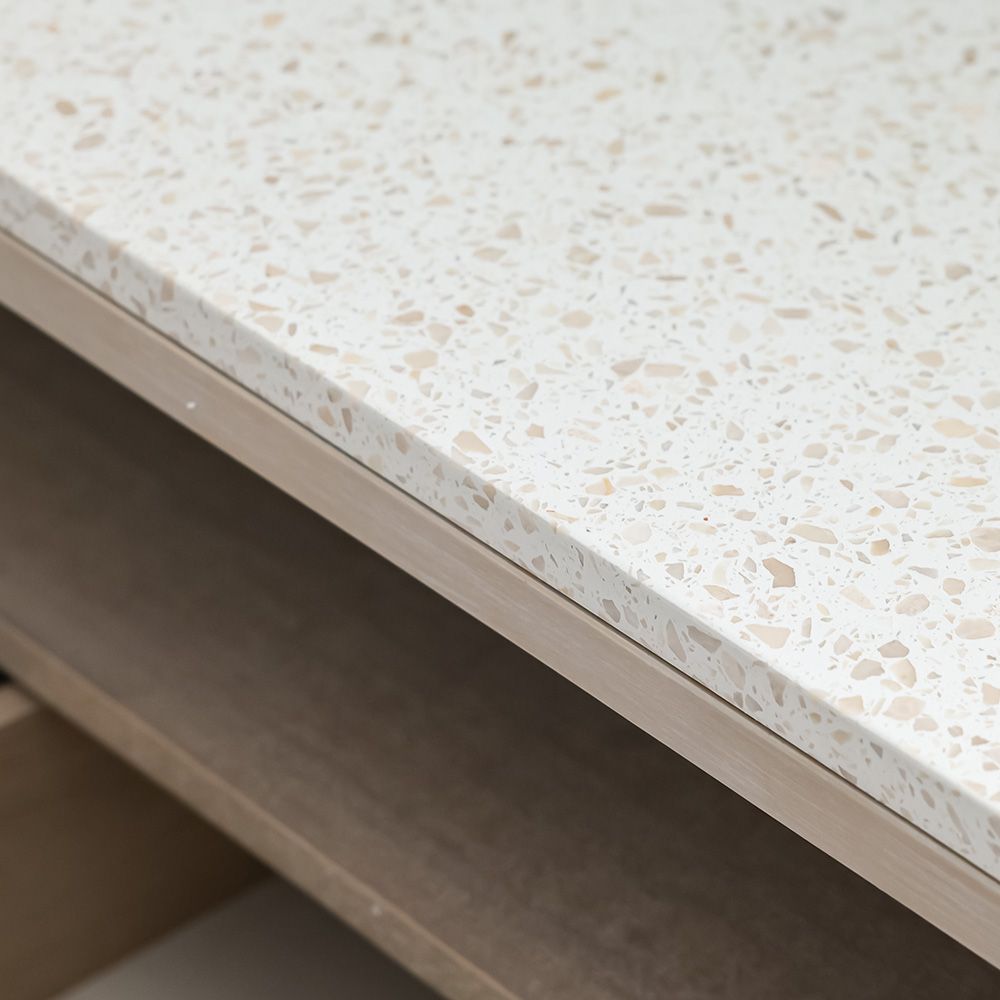The combination of terrazzo, beige, and gold shades adds a touch of elegance and allows it to blend well with a variety of décor styles.