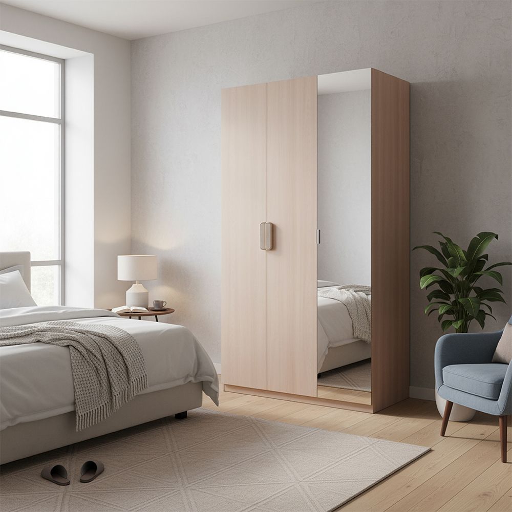 The Travvy 3-Door Wardrobe displays a harmonious blend of elegance, functionality, and innovation, designed to elevate the look and utility of your living space.